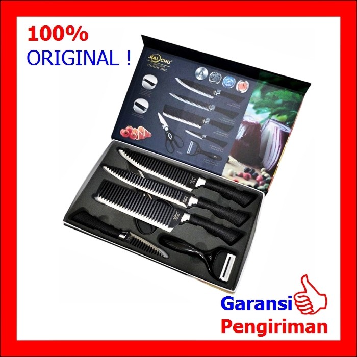 Selamat datangSemua produk di etalase kami adalahReady stock dan siap dikirimTerima kasih ...Pisau set ini terdiri dari 5 buah pisau dan 1 buah peeler dalam berbagai macam ukuran yang memudahkan anda dalam memotong berbagai daging, sayuran, buah, dan berbagai bumbu masak lainnyaSpesifikasi :- Terbuat dari stainless steel Tebal berkualitas dan diolah dengan lapisan anti lengket yang menjaga agar makanan tidak lengket pada pisau- Gagang gaya baru lebih nyaman untuk digenggam memastikan penggunaan pisau yang aman saat memotong- Lama dipakai dan tahan lama : disarankan mencuci pisau dengan tangan agar lebih tahan lamaPisau Set terdiri dari :- Chopper : bisa digunakan untuk memotong berbagai macam daging- Chef Knife : bisa digunakan untuk memotong daging, mengiris sayuran dan mencincang bawang- Carving Knife : berbentuk mirip dengan Chef Knife dengan ujung pisau yang lebih runcing- Utility Knife : bisa digunakan untuk memotong dan mengiris bahan makanan (berbentuk chef knife ukuran sedang)- Paring Knife : bentuknya mirip dengan Chef Knife namun dengan ukuran yang lebih kecil bisa digunakan untuk mengupas maupun menyayat bahan makanan- Ceramic Peeler : bisa digunakan untuk mengupas kulit kentang dan wortelUkuran Produk :Ukuran Packing :37 x 22 x