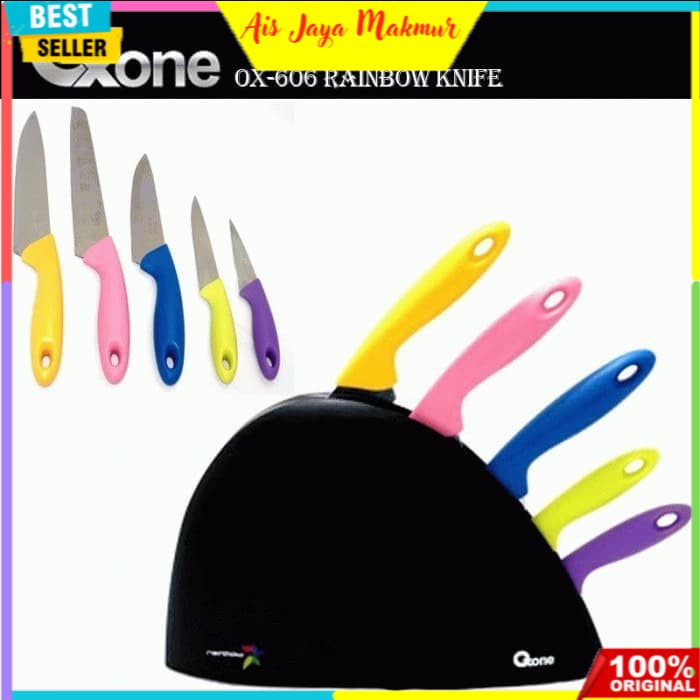1 Pcs Pisau Koki 7.5" 1 Pcs Pisau Roti 8" 1 Pcs Pisau Koki 6" 1 Pcs Pisau sehari hari 5" 1 Pcs Pisau Tulang 3.5" 1 Pcs Tatakan PlastikRainbow Knife Set OxoneOxone Rainbaw Knife Set menghadirkan suasana dapur penuh warna warni seperti pelangi. Pisau Set Oxone ini terdiri dari 5 buah pisau ukuran berbeda dan warna yang berbeda. Sangat cocok uutuk anda yang menyukai memasak dengan nuansa fullcolor. Terbuat dari bahan stainless steel anti karat Dilengkapi dengan wadah plastik yang awet dan tahan lama 1set terdiri dari 5pc pisau dan 1pc wadah pisau Berat barang :1kgCatatan