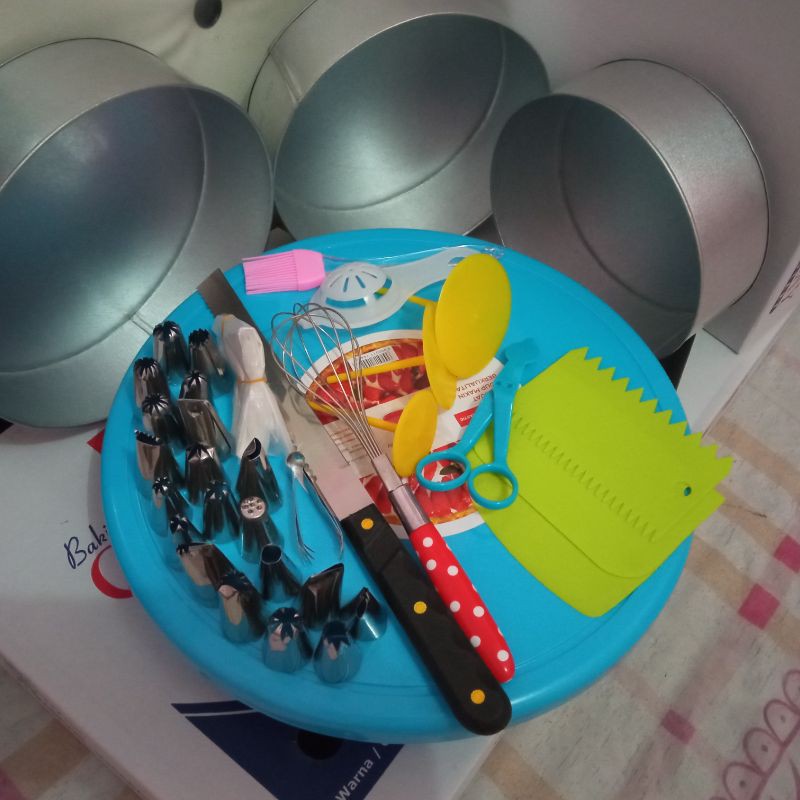 set peralatan dekorasi-meja putar (warna dikirim randem) -20 bentuk spluit lokal-skap beda bentuk isi 3(warna kirim randem) -paku mawar 3 bentuk-gunting mawar-kuas silicon-saringan telur-palstik segitiga-kocokan polkadot-pisau roti-loyang bulat 3 ukuranpengemasansudah di lapisi bubble warp da