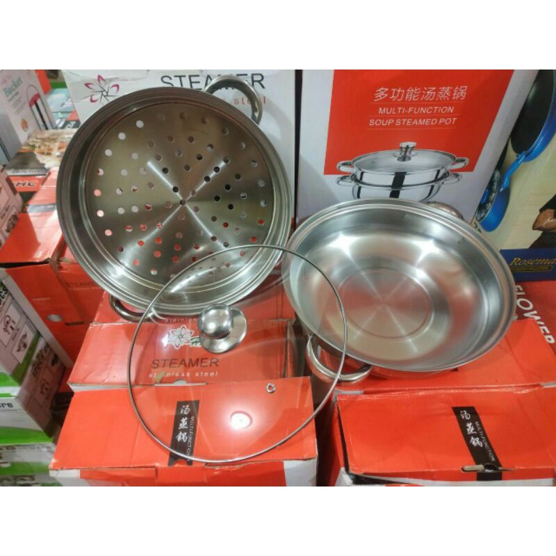 STEAMER 2 SUSUN (KUKUSAN 2 SUSUN)Panci kukus/steamer pot size 28 cm.Panci kukus serbaguna terbuat dari bahan steinles yang terdiri dari 2 susun.Kegunaan:✔️Mengukus bakso tahu✔️ Siomay✔️Bolu kukus ✔️Nasi✔️Cake, dll.Penggunaan bisa di pakai sesuai kebutuhan kita..bisa 1 susun & 2 susun.Bahan steinles berkualitas dan di bagian tutup terdapat kaca sehingga mudah melihat tingkat kematangan apa yang kita kukus atau m