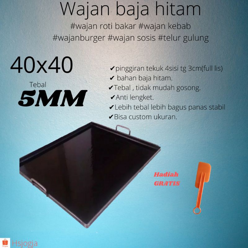 custom wajan 40*40cm 5mili 4sisi pinggiran tinggi 3cm.pojok dilubang untuk buangan sisa minyak wajan bisa dipakai untuk panggang roti, kebab,burger, sate cumi, telur gulung, daging dlljika blm jelas harap chat admin untuk bertanya bagian yg belum jelas