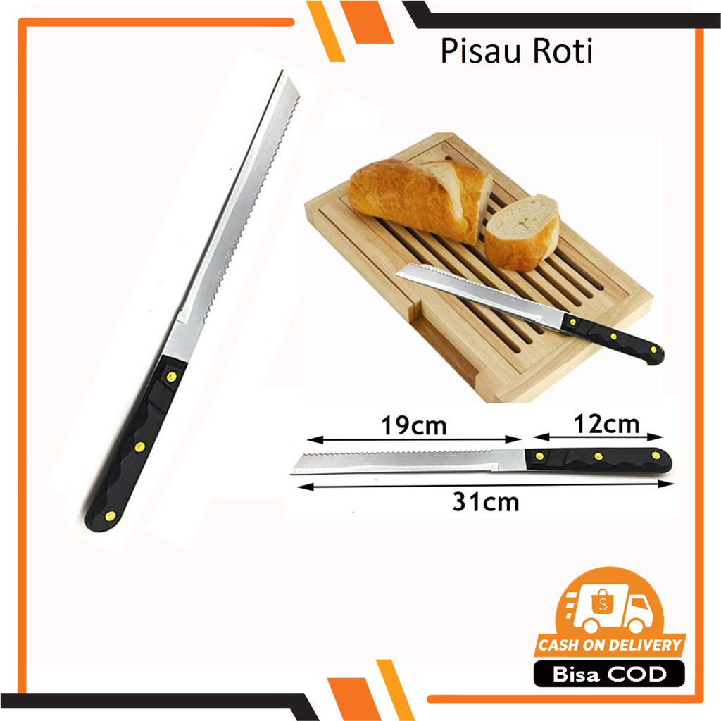 Pisau Potong Roti Tawar Bolu Kue Tart 2 Sisi Stainless SteelPisau Roti / Bread Knife adalah pisau yang berguna untuk memotong roti kue Bolu.Kue atau roti dengan teksture yang lembut dan mudah hancur memerlukan pisau khusus untuk memotongnya, mata pisau roti ini dilengkapi dengan pola gerigi sehingga bisa digunakan untuk memotong roti agar tidak hancur.Pisau ini memiliki 2 sisi yang bergerigi dan mulus(pisau biasa),sehingga memudahkan anda dalam memotong.Bahan: Blade pisau Stainless Steel (Anti karat), Handle Plastik dengan warna hitamDimensi:- panjang pisau keseluruhan 31cm- panjang gagang 12cm- panjang pisau saja 19cmGunakan pisau roti ini untuk memotong kue roti kesukaan